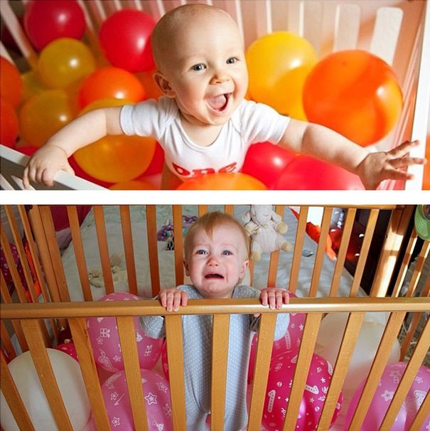 Who thinks, “Let’s put our baby in a box with packing peanuts and take a picture?”